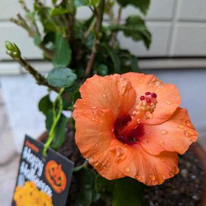 おはようございます☀ ちょっと小ぶりの花のハイビスカス🌺 スーパーで見切り…なんと税込54円❗ ヨレヨレだったけど来年も咲けばお得かな~と買ってみました😁 札がハロウィン🎃 オレンジの花だからなのね😄