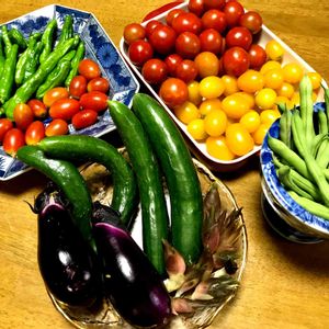 本日夕方に収穫🍆🍅🥒 手入れを疎かにしていたら、ナスにテントウムシダマシとキュウリにウリハムシが発生😱💦 害虫退治の前に収穫しました。 ナス、キュウリ、ミニトマト、インゲン、シシトウ、ミョウガ