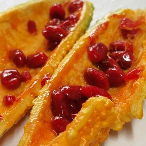 カット🔪してビックリ‼️ こんなに綺麗に赤いタネになるなんて〜👀 ささげ豆🫘みたい😆 ②昨日収穫した時はそれほど黄色くなかったのに 今日食べる用の2つを常温に置いてたら黄色味増して割れ目入ってたし💦 タコライスに入れたけど苦味もそれほどではなく美味しかったです😋 ② ゴーヤ7本 小玉スイカ2つ 1.4と1.3kg 小さい方はお仏壇へ ③ ラインニュースだったかな?種を取りやすい切り方を見たのでやってみたよ ④ 多肉屋根に水が溜まるので ⑤ 右端に垂木追加で改善しました!✌️ でもスチールラックのビニールには溜まります💦 こちらの改善は来年にします😅