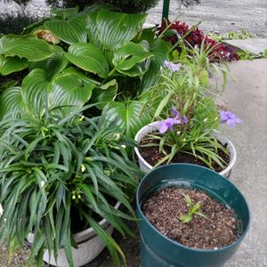 ルエリアの白、お迎えして鉢増し完了💪 紫のこぼれ種から子どもちゃん生まれていました 早速植付けて、揃ってパチリ📸 カフェドパリ、ドラッグストアで、みっけて大人買い😆