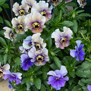 1枚目 (上段左から) メゾンドビオラ 青の聖騎士 メゾンドビオラ 青魔導士 メゾンドビオラ グランブルー (下段左から) 吉村さん育種 ブルーインフィールド 桂楓園さん フェデネージュ 見元園芸さん パピージョルジュ グランデ 2枚目 左→ゲブラナガトヨさん アマゾネス 右→ゲブラナガトヨさん ルナ 【品種紹介】 今朝のお花です😄パンジービオラのシーズンは賑やかでいいですね。 メゾンドビオラは、去年1株だけ育てていました。花が美しいだけでなく、生育がゆっくりで、株が乱れず、春でも4号鉢で間に合ったところが、気に入って今年も購入しました。1株で大きくなるのも良いですが、小さくコンパクトないままの品種もありがたいですよね。青シリーズ3つを並べてみました。どれも綺麗ですね。 下段は、初めて購入した品種たちです。 どう生育するかは分かりませんが、すでに花上がりもよく旺盛な感じがしますね。こうやって並べると、各育種家さんの美意識といいますか、個性の違いがありますよね。どれも美しいですね☺️ 2枚目は、ゲブラさんの新作(アマゾネス)と試作品(ルナ)でまとめました。アマゾネスは完全な名前買いで、ネットで注文後、どんなワイルドな株が来るのかとワクワクしていましたが、なんとも可憐な株が来ました😊ルナも、盛り盛り咲いています。画面越しだと地味な色合いですが、沢山咲くので現物は華やかで、目を引きますよ。ゲブラさんの品種は名前が覚え易いところもいいですね。