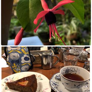 こんばんは🌃 今日のお花 フクシアさん❤️💜💚 (昨年4月撮影) 今年はまだ蕾もありません🌿 今日の昼休み… あまりに忙しくて リフレッシュの為に cake & tea 🍰☕️ 私は苺🍓といちじくのケーキ。 友人は苺ショート🍓。 午後の仕事も頑張りました🤗