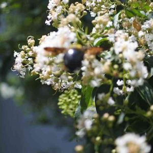 白いサルスベリの花に 突進する黒い固まり 百日紅だとイメージに合いませんね。