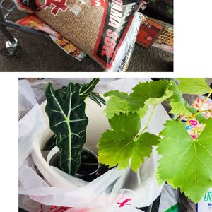 今日の買い物(o^^o) ブドウ、しなのストレスマイル シャコバサボテン、アロカシア ぶどうの鉢 オベリスクに、赤玉、腐葉土。 楽しかったです*\(^o^)/*