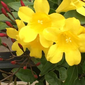 こんにちは😃 風がとても強く肌寒いです🌀 カロライナジャスミンさん🌼は 開花しました🎶 ハゴロモジャスミンさん🌸は まだ蕾ですね🎶