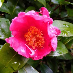 おはようございます☁ 山茶花 雨にあたり 中々会えない山茶花に会えました🌺