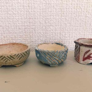 セキショウの豆鉢に色々と飛び込みました もう入れないよ! 童話の手袋みたい🧤 この鉢は山野草会の人の手捻り鉢