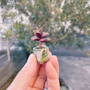 セダムの豆鉢 入れたすぐはシワシワですがだんだんと元気になってくる。 今80% 自作鉢、絵が流れてしまったヤツ