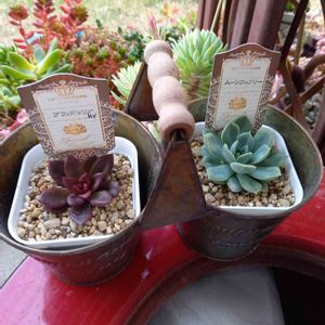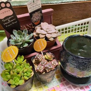 おはようございます(*´-`*)ゞ ホームセンターに こたつ布団を新調に行ったら❤️ 多肉さんと👀が会いました🎵 👑ラベル❗お初です ほとんど残っていませんでしたが 厳選してお二人様 迎えました💓 お二人様を連れ帰る、ちょうど良い 岡持ち?も有りましたので✨ 主人がほらほら立ち止まらないよ😁 言われた時にはしゃがみこんで 品定め😆黙ってカゴ持ってきてくれて ありがとう💕✨ でもお二人様で止めとく