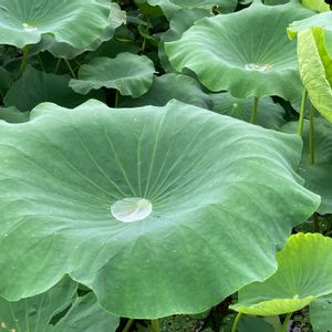 今日のお花 ハス🪷、の葉っぱを愛でる会 ハスの葉が例年よりも多く大きく広がってます 雨の日に水玉をはじくのも綺麗ですが、こうして日に当たると際立つふちのウェーブも美しい 明日からお盆 このハスの葉を器に見立て、胡瓜と茄子と洗い米を盛り水の子として精霊棚に飾ります