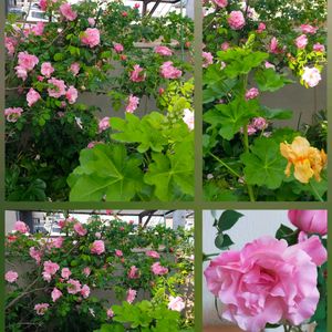 GWは優雅に..😅 横たわった大量のパンジービオラ等を カットし真夜中に生ける ❶❷ 昼間 軒下じゃなくテラスに置いてみた❸ 優雅に暴れる薔薇 スパニッシュビューティー❹