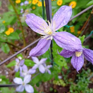 小雨に濡れた今朝庭の花2種 ①クレマチス(名前不詳) ②オジギソウ ③ゴンズイの実 ④⑤彼岸花