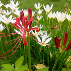 晩夏〜初秋の今庭 彼岸花が咲き、タマスダレとコラボしています。 ②コーナーに植えたクリー色のタマスダレ グランドカバーのディコンドラもげんきになり始めました。 ③最後の花のクレマチスは色も褪せて、花びらは裏面の方が綺麗😅 ④最後のクレマチスは1輪のダイアナ ⑤秋咲き?の始まりかな…ジュード.ジ.オブ.スキュア🌹