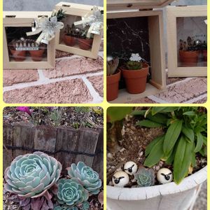 おとつい作った寄せ植えです。 クリスマスの人形乗せようかと 思ったけど。。はて どれを入れ換える? もう このままでいいかな。 新しいのん作ろう♪ デビー カットしたところから 幾つか小苗が 出てきて育ったもの。 だったはず。 ちょっとしたブーケのような 花束みたいですね☺️かわいい