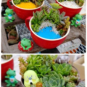 暑い暑いと 寄せ植えを避けてはいられない (根の心配もあるけれど、 作業がキツい個人的理由(笑)) てことで 少しでも涼を感じていただけるよう 扇風機前で乾かされながら カエルちゃん飾り砂に乗るのを スタンバイ中 もう1つは ガチャピンの出来損ないみたいな子 はやく誰かの所へ嫁にいきたい!と声がしてきたので (ほんまかいな) 寄せてみました