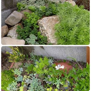 久しぶりに多肉花壇です。植木鉢が埋もれて見えない(笑) 残土から出てきた石を積み上げた所へ セダム中心に植えたり ボイボイしたり 庭のセダムはこの季節焦げてましたが ここは水はけもいいし遮光したら イキイキしてます この前の寄せ植えに少し使いましたよ