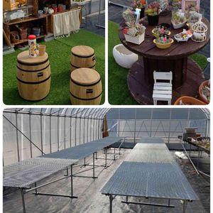 でーきーたー! ハウス内の棚! いろんなところに 『アジ』がありますが。 苗トレーが 滑り落ちやんだらマルさ! 入って正面に ケーブル机の ディスプレイ棚があって 左がお喋りしたりお茶したり お弁当たべたりの くつろぎの場所 右が寄せ植えとかの作業机 まだまだ苗が少ないから 防草シートの 黒いのが照り返して めっちゃ日焼けするー!!!