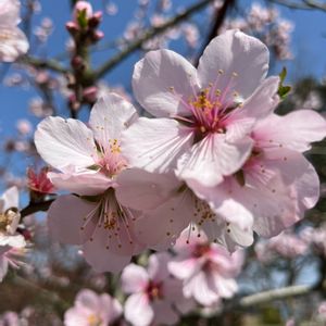 今日はポカポカとしたいいお天気だったので、フルーツパークをキョロキョロ散歩🚶していたら、梅や桜が花盛り、めっきりと春めいてきましたよぉ〜😘 そんな春の陽気を楽しんでいたら、花弁の先端が濃いピンク色に染まった「アーモンド」のお花が一つ二つ咲き始めていました。 もう春ですよぉ〜🥰