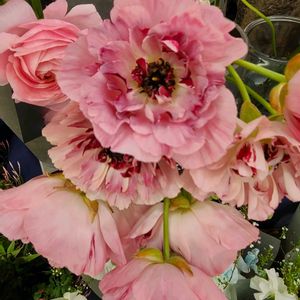 ローズピンクの繊細な花びらの重なりがエレガントな、「ラナンキュラス・シャルロット」でおはようございます✨️💐✨️ 週末に、いつも優しい紳士な叔父にお誘い頂き、久しぶりに銀座で歌舞伎やとろける牛タンシチューランチを満喫後、原画買い付けに同伴した山本容子さんの銅版画展《愛めぐりの詩(うた)》の会場に、シャルロットが飾ってありました🎶 https://www.wako.co.jp/f/exhibitions/detail.html?id=d2eb5952-87e2-4ec0-9797-38bff36d22b6 "シャルロット"は、ラナンキュラスの中でも大きな花形とフリルのような花弁が特徴的。薔薇や芍薬のような華やかさとエレガントさを併せ持つ、"アネモネ咲き"が魅力の品種🎀 ちょっと前までは"普通咲き"しか流通していなかったラナンキュラス。 最近では、ラックス、モロッコ、ポンポン、そしてこのシャルロット…と、豊富な咲き方が出回り、ラナンキュラス愛好家の裾野をじわじわと拡げつつあるように感じます🥰💞 _花言葉は、「晴れやかな魅力」、「光輝を放つ」…他。