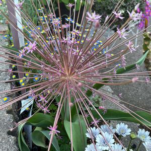 毎年育てたくなる、変わったフォルムのアリウムシュベルティ。 花火のように咲いています。中心から伸びて、小花が咲きます。 3枚目は、去年育ててドライにしたもの。かなり硬いです。 ら