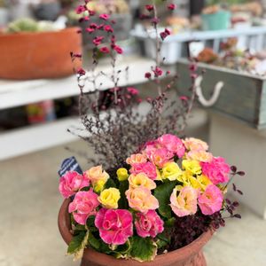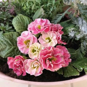 松原園芸さんのプリムラ。寄せ植えには、前から欲しかったぎょうりゅうばいを。このプリムラは、花がクリーム色からピンク色になり、色合いが変化して見応えあります。今日は、雨で濡らさないように、ちゃんと屋根下に移動しました。
