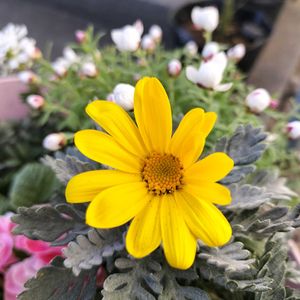 おはようございます🥰 ユリオプスデージーが咲きました💛💛💛 明るくて可愛いです✨ ②花かんざしも少しずつ 変化してます🩷(*˘︶˘*).。.:*♡ 開花がめちゃ楽しみ🎶 今日は穏やかでポカポカ日和です☀ 午後風が強くないといいな〜💕💕
