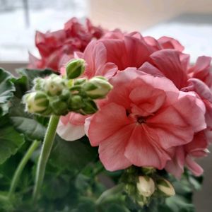 おはようございます😊 昨日の夕方から今朝にかけて ❄が降り少し積もりました 10センチ弱位です。 窓辺で元気に咲いているゼラニウム達に癒されました✨ ②ミニゼラニウムちゃん 元気に頑張っています😍💕💕 寒いので体調に気をつけましょうね🍀🫖🍵♨️💕