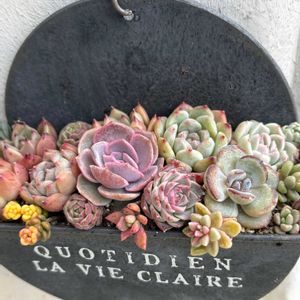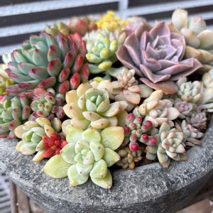 お友達にいただいた多肉たち〜。 ひとつひとつの多肉が、可愛い味わいをだしていてお気に入りです。真ん中は、ブルーサプライズです。 こんな感じに、多肉たちが、伸びたい方向に動き出しているところが、私の好きな見どころです。