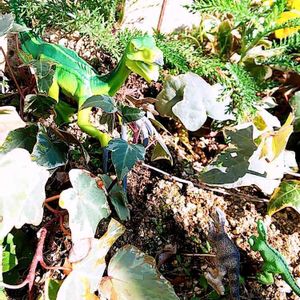 花壇に恐竜🦕 戦ってる🔥 ジャングルで恐竜たたかってるーって 息子がセッティング アップで撮るとほんとにジャングルみたい‼️