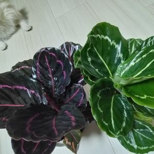 仕事帰りに植物屋さんへ寄ってみたら入荷したてのツヤツヤなカラテアさん発見✨️ 6個位欲しいのあったけどしばらく悩んでこの2つをお迎えしました^_^ ドッティーは植替えで失敗して☆にしてしまったので、2度目のお迎え グリーンローズは初めましてです どっちも渋くてよい👍️