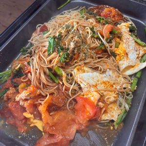 お昼ご飯 焼きスパゲッティ 細目スパゲッティ トマト、たらこ、菜の花、 目玉焼き、ケチャップ 塩味の茹で汁に、エゴマオイルでスープとして。