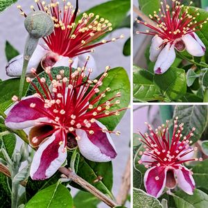 フェイジョア❣️ 今年は 沢山のお花が咲いてくれそうです❣️ 昨日5輪 蕾も沢山有ります✌️✨❣️ (筆で受粉しました) 実ができますように🙏😊 昨年より開花遅いです。 追記 2020.12 お迎えしました💐❣️ 記録 6/3は10輪❣️ 6/5は13輪❣️ 6/6は18輪❣️ 6/11.23輪❣️ 結果、実はなりませんでした……(・・