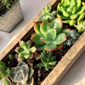 寄せ植えしたてのミニミニ室内多肉さんたち あまりぎゅーぎゅーにしないようにしました。木製箱百均リメイクですがウォールナット色好きです〜(*´-`*)