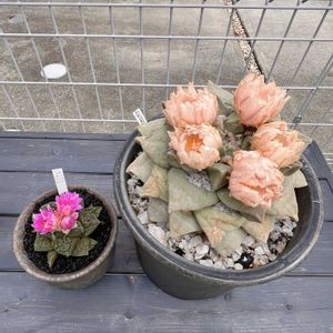アリオカルプスたちが続々と開花🌸 ちょっと時期ズレでしたが、もしかして、に期待して全ての花でつんつんと花粉交換しておきました😆 亀甲姫牡丹の爆誕に期待❗️🤩