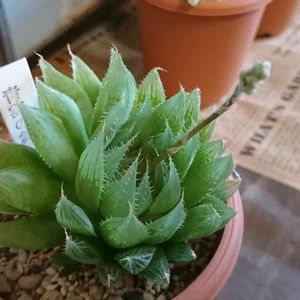 青雲の舞✨ おはようございます 朝からヒドイ雨です☔ 県内にも警報が沢山出ています。 皆さんもお気を付けください😭 台風で室内に移したハオルチア3兄弟🌱 室内の方が良かったみたいで 葉焼けがみるみる治りました😅 この子は花芽(?)まで出てきました🙆