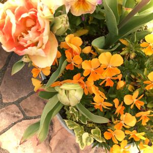 チューリップ〔オルカ〕 枝咲き&八重咲き☆*:..。.:*☆ あふれるように咲きました^ - ^。 4球根植えて2球咲きました♪ パンジーさん達と一緒にプランターに寄せ植えして、水切れさせてしまい花芽がカラカラ乾き失敗したのかもしれません。 八重咲きはお水たっぷりお願い致します🤲 昨年のチューリップより🌷