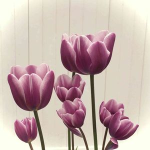 チューリップ〔パープルエレガンス〕 紫色に白いふちどり、丸い花びら 茎がすっ〜と長く伸びて風にゆらゆら揺れるチューリップでした*・゜゚・*:.。..。.:*・' 今年も咲くのが楽しみです^ - ^♬ 毎年球根を買って咲かせたいおすすめ品種です^ - ^♬ 昨年のチューリップより🌷