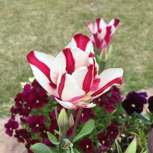チューリップ 〔フレミングクラブ〕 枝咲き、白に赤のアートなチューリップさんでした。1球から数輪の花が咲きボリューム満点💯🌷 昨年のチューリップより🌷