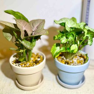 シンゴニウム、ネオンとホワイトバタフライをお迎え。初めて行きましたが、カインズは小さなサイズのグリーンが沢山✨ それぞれ200円しなかったです。土も悪くなさそうだし、根っこもよく貼っています。テラコッタ鉢もペイントして可愛くなりました😊