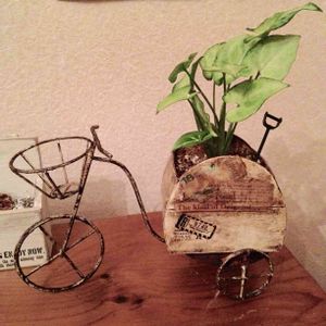 シンゴニウム下から新芽が出できておりますp(^_^)q 3coinsのミニ自転車オブジェはサビ風加工♫