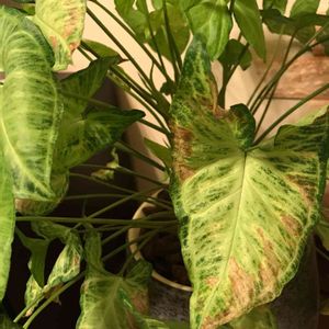 シンゴニウム/ホワイトバタフライ 3月下旬に植え替え&株分けをした以来、徐々に葉が茶色に変色してきました。 原因や対策など教えてもらえると嬉しいです…。