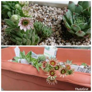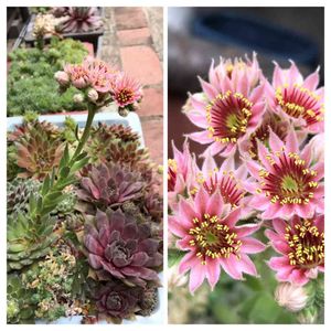 うちにもセンペルさんのお花咲きました🌸 子持ち蓮華と同じで咲くと枯れてしまうみたいです😢 咲いたのは手前にもいるモケモケしたセンペルでグレーの子はルンヨニーです🎵 写真撮る為にサンルームに移動しましたがいつもは遮光なしで玄関の軒下にいます☺️ お粉の多い子は葉焼けしにくいです\(◡̈)/♥︎ モケモケの子も同じかな\( ö )/