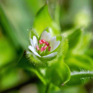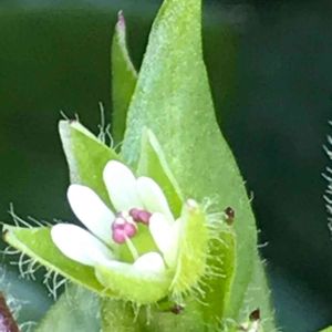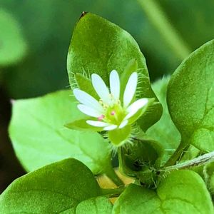 🍀野の花・ミドリハコベ (緑繁縷) 1 🍀 今日も散歩コースで見つけた野草、ミドリハコベです。 春の七草の一つ。 【ミドリハコベ (緑繁縷)】 分布・・・在来種で日本全土に分布。1~2年草。 生育地・・・道端など至る所に自生。 茎の特徴:色は緑色。片側1列に列毛と呼ばれる微細な柔らかい毛が生えている。地を這って、途中で茎を持ち上げる。茎枝分かれして、10~30cmになる。 ❮花の特徴❯ 花径・・・約6~7mmの白い花を付ける 花弁:5枚。10枚に見えるのは、2つに深く裂 けているため。 萼片・・・5枚 花柱・・・3本 雄しべ・・4~10本
