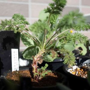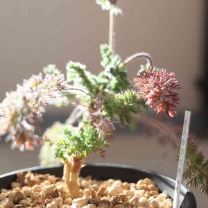 ペラルゴニウム・オレオフィルム 種がどんどん実って、頭の方が太くなり、根本から分岐を始め、枝も短くモフモフ! 陽に当てて、風が強いから太く、枝も短く引き締まった形になるのかな。 ただ、根本の太さは変わらず…。めっちゃアンバランス。 種が飛ばないように先端をテープで固定。貼り方めちゃ適当😅