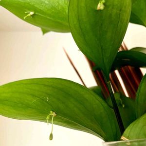 先月お花のサブスクに入ってた葉っぱ🌿 水差しを辞めベビサンの鉢にブスっと挿しておいたら 葉裏の真ん中にお花が下がってたの🤭 朝は小さなお花見えたのに今はこんな感じです! 何て名前でしょうか? このままで根が付いたりしますか? 知ってる方お願いします🙏 ⬇️ まろんさんに教えて頂きました🙇♀️ ✨ルスカス・ピポフィルム✨