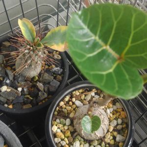 葉っぱたち ↗️ステファニア スベローサ ↘️ボンバックス エリプチカム ↙️ステファニア ピエレイ ↖️フィカス アブチリフォリア 梅雨で良かったこと、塊根達の根っこがめっちゃ動きだしたこと👀 新しい葉が出たり、これから大きくなる葉達がかわいいです☺️