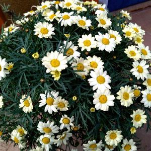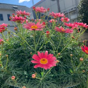 マーガレット 🌼今日のお花🌼 今年4月のpic その後切り戻して、小ぢんまりとなり、 若葉出て青々してるけど、花芽がつくかどうかは…