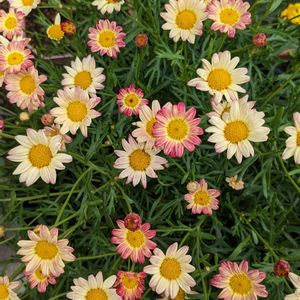 5/4picに枯れ枯れの酷い状態になっていたマーガレット(´༎ຶོρ༎ຶོ`) 原因は少し弱っていたのに固形肥料を混ぜた土で株が一気に弱ってしまった様です💦 残念ながら諦めて全部切りそのままに🥲 そして‥‥‥なんと花が咲いて来ました。ホントはピンクの2色咲きなんですが、全体的に白で咲き、徐々にピンクが入ってきました。 もうすっかり枯れた様な状態で諦めていたのに😑 植物って凄い(@_@)‼︎良かった〰️嬉しいヾ(@^▽︎^@)ノ ワーイ💕💕💕