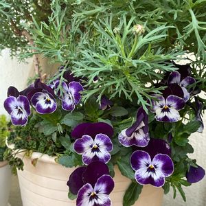 マーガレットの足元で、ビオラが咲いてます💜🤍💜 こちらのマーガレットも、蕾がだいぶん膨らんできたみたい😊