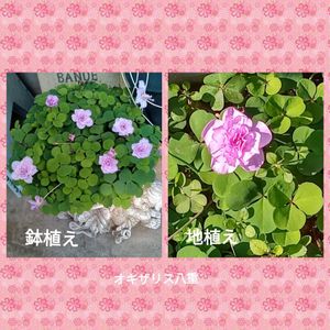 サクラ草 寄せ植えの隣の株が色違いのが出てきました。これは これで いいかもってかんじです。 オキザリス八重 天気☀が よくて咲いてきました。 おはようございますm(_ _)m 今日は☀マークです。